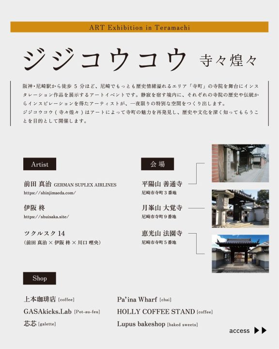 ジジコウコウ(寺々煌々)はアートによって寺町の魅力を再発見し、歴史や文化を深く知ってもらうことを目的として開催します。